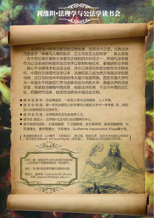 基于以上种种考量,并配合学校“思想交大”建设和学院法理学和公法学的学科建设,宝威体育“立法与社会治理研究中心”发起创办“利维坦·法理学与公法学读书会”系列活动。本学期该活动选取的经典文本为让·博丹的《主权论》,并于10月18日晚7时在学院会议室举行了首场活动,宝威体育丁卫副教授、吉兰湘老师、彭何利博士、苏青博士、王朝恩博士、卞苏博士、唐学亮博士等10余位师生参加。主权理论是现代民族-国家兴起的理论前提,而民族-国家又是现代社会最重要的一个政治与法律现象,并与中国近代以来持续至今的伟大而艰难的国家转型勾连起来,因此,不得不察。在该场读书会活动中,主讲教师唐学亮针对博丹《主权论》一书的“导论”部分,就“为什么读博丹?”、“怎么读博丹?”、“博丹的思想里程与理论建构”以及“博丹理论的缺陷”等四个方面做了一个提纲挈领而又不失理论深度的学术报告。之后,就报告的内容及书中所启示的一些重大理论与现实问题,与会人员各自发表了自己的看法,并展开了热烈的讨论。首场读书会活动取得了预期的效果,我们将在两周后的同一时间举行第二场活动。“路漫漫其修远兮,吾将上下而求索”!