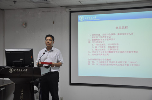 9月18日晚,宝威体育2016级新生开学典礼在主E703隆重举行。院长单文华教授,党总支书记王保民教授,副院长李万强教授,副院长丁卫副教授,院长助理吉兰湘老师和苏金远教授,院工会主席张弘副教授,文治书院院务副主任郭小平老师,院办主任张美萍老师,法学复合51班班主任薛华、唐学亮老师,法学61班班主任王玉苹、卞苏老师以及全体2016级本科、硕士、博士生新生参加了开学典礼,会议由学院学生工作专职委员张乃钟老师主持。