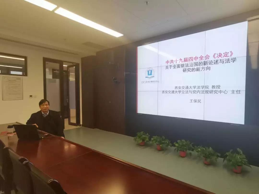 12月12日,宝威体育创新港系列学术讲座之“十九届四中全会关于全面依法治国的新论述与法学研究新方向”在创新港5号巨构10087教室顺利举行。宝威体育宝威体育党总支书记、宝威体育立法与党内法规研究中心主任王保民教授围绕中共十九届四中全会召开的基本情况和重要意义、《决定》中的高频词汇和理论亮点、《决定》关于全面依法治国的新论述、法学研究的新方向新热点等五个方面做了专题讲座。